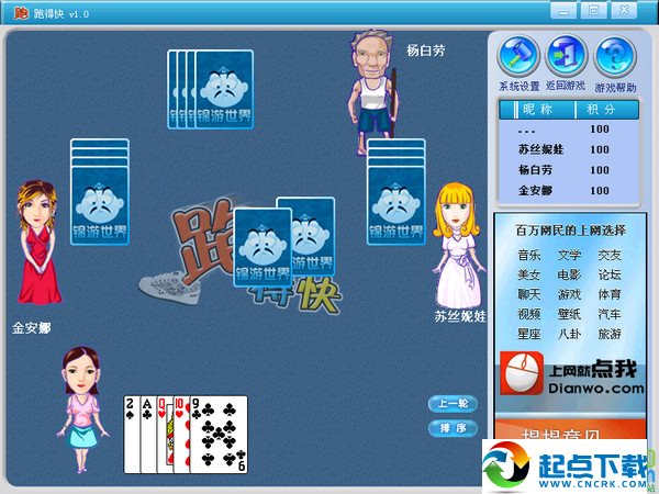 本游戏的牌点由大到小排列为:大王、小王、2、A、K、Q、J、10、9、8、7、6、5、4、3;