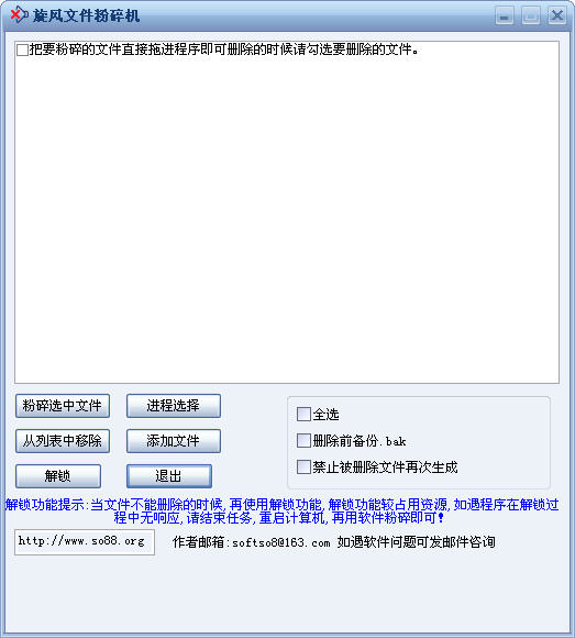 旋风文件粉碎机是一款绿色的文件粉碎工具,可以删除一些手动无法删除的文件,病毒,恶意软件。 它使用非常简单,你只需把想要粉碎的文件拖入旋风文件粉碎机即可。