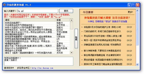 寻仙动脑筋爷爷答题器,为了更方便的查询动脑筋爷爷题答案,多玩寻仙专区特意制作了寻仙答题器,以便玩家使用。