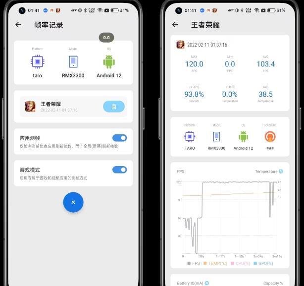 8. 场景5 - 功能 - 帧率记录,点击测试的王者荣耀后,可以查看帧率记录和曲线。