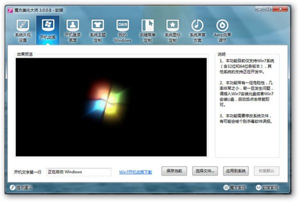 想让您的开机登录画面与众不同么?想换成超华丽的Windows主题包么?想换掉系统所有能看到的图标样式么?想把系统信息都设成您的个人名字或者公司名字么?想定制右键菜单的内容和背景么?想换掉Windows开关机声音么?想控制你的桌面图标么?想去掉或更改快捷方式的箭头么?想改造你的开始菜单和任务栏么?有了魔方美化大师,一切统统搞定。