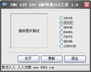 PNG GIF JPG BMP转换ICO工具 1.1 免费版 PNG GIF JPG BMP转换ICO工具是一个轻量级的免费图形转换工具,可以将PNG GIF JPG BMP格式的图形文件转换为ico图标。它使用方便,只要鼠标拖拉一下就可以完成转换。