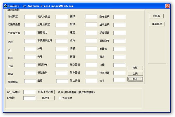 NBA2K13多功能修改器是一款功能多样化的2K13修改器下载。可修改球员的27项能力以及 年龄、MC上场时间、无限体力 支持SP修改、GS修改 中文界面,使用方法一目了然