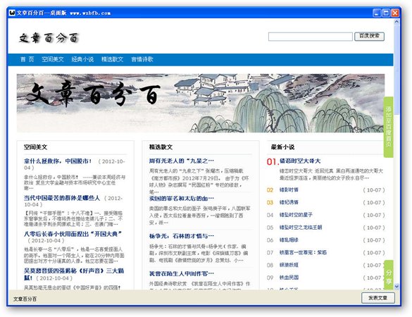 文章百分百是一个以美文为主题的综合文学网站.内含有各种优美哲理文章,优美伤感文章,现代诗歌散文,优美抒情散文,小说.读文章,就用文章百分百桌面版!