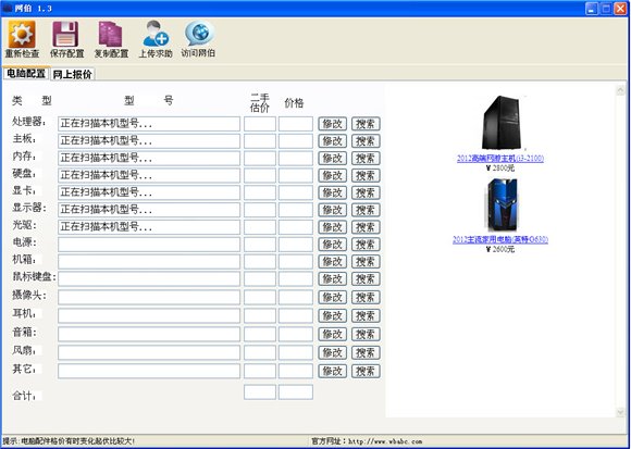 电脑配置价格查询器功能: 一、自动查出电脑配置及二手估价和全新价格,包括有:cpu,内存,硬盘,主板,显示器,光驱的行情价格。 二、完整的电脑组装diy配置报价。(天天更新行情价格)