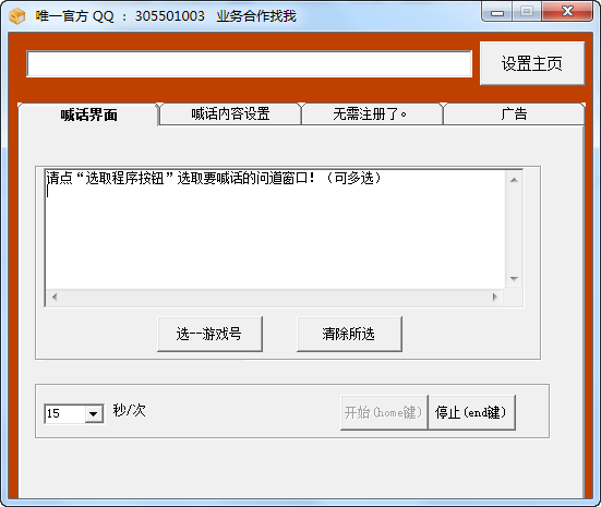 打开喊话器,点击选--游戏号,选择想要喊话的问道客户端,然后在喊话内容设置中输入想要喊话的内容,选择喊话时间间隔即可开始喊话。