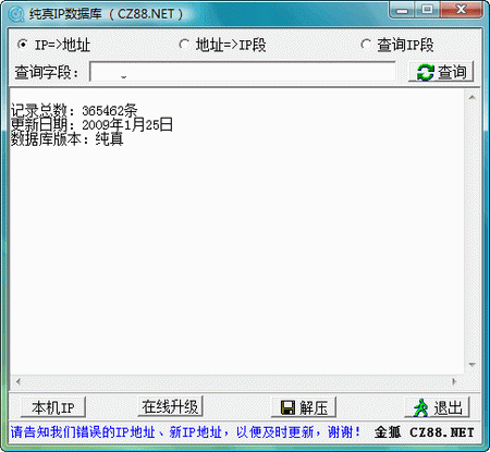 包括 最全的网吧数据。希望能够通过大家的共同努力打造一个没有未知数据,没有错误数据的QQ IP。IP数据库每 5天更新一次,请大家定期更新最新的IP数据库! 因为IP地址数据是民间收集的,电信也会不时的更改IP段,所以有点遗漏、错误是难免的。随数据库附送IP解 压,查询软件。假如发现IP地址有不对的,或想提供新的IP地址,请到纯真IP小秘书提供IP地址数据,或者登陆 纯真时空论坛“电脑板块”中的“代理及IP板”块告诉我们。或者加入纯真QQ门户,在QQ上就能直接上报错误的IP数据 ,以便及时更新IP数据库。谢谢!