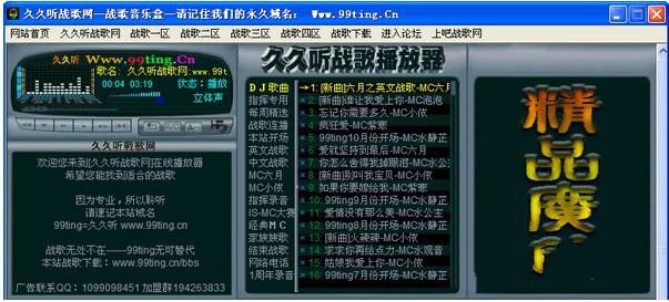 久久战歌播放器可以下载到本地播放,久久听战歌网播放器可以像QQ一样靠墙自动收缩!(就算您上班在偷听歌,也可以托盘隐藏起来,老板看不到)很适合方便指挥激情。