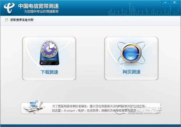 中国电信宽带测试器 中国电信10000推出的官方版本宽带测速工具 有两种检测模式:下载测速,网页测速 分别对应下载和网页浏览两种模式下的网速测试