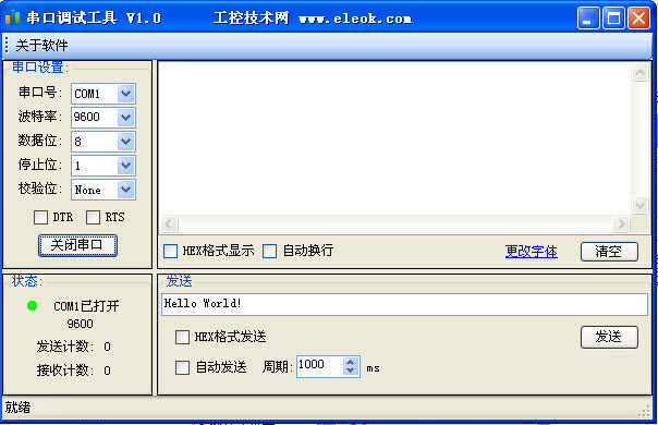 工控串口调试工具 V1.0 绿色版 工控串口调试工具 小巧的串口调试软件,采用c#开发,运行本程序需要目标机器上安装.net framework 2.0或者以上版本:本软件支持自定义串口号、波特率、数据位、停止位、校验位、发送周期。