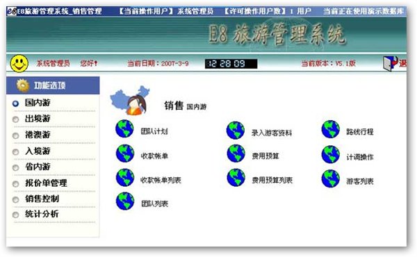 E8旅游管理软件是专为旅行社、旅游公司、相关旅游行业而开(发)的,包含出境游、国内游、 港澳游、入境游、国内地接、省内短线、计调、财务结算、客户关系管理、网络营销等多项内容的全方位的信息管理系统,可以帮助旅行社、旅游公司、旅游相关行业在基础信息管理、直客销售、计调操作、同业分销、财务结算等各方面进行综合的管理。它是一套为旅行社、旅游公司、旅游相关行业量身订做的企业资源计划ERP)、客户管理管理系统(CRM)。