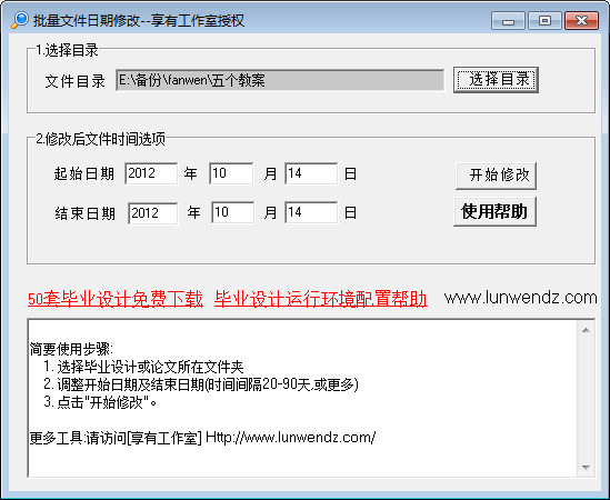 文件日期批量修改工具可以批量修改文件的日期,大家都知道,如果你的毕业设计文件的修改日期/创建日期,如果是去年的,或是更早,那老师不是一看就知道,你的设计就不是你自己做的吗?所以修改文件日期这个是第一步,也是比较重要的一步。