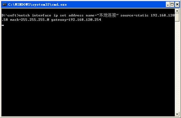netsh interface ip set address name="本地连接" source=static 192.168.120.58 mask=255.255.255.0 gateway=192.168.120.254