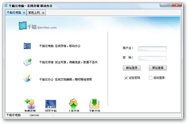 先输入帐号和密码登录,然后在你的“千脑云电脑”的桌面上点击鼠标右键就可以在快捷菜单上选择“上传文件”、“下载文件”以及其他的功能。只要会用Windows,你就会使用千脑。只要点击“鼠标右键”,一切就这么简单。