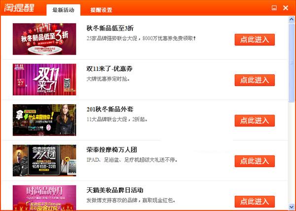 好商品不等人,聚划算、天天特价、今日最大牌、1元疯抢、1折巨优惠等活动每天准时提醒!官方促销提醒