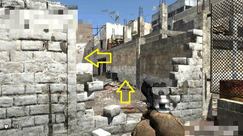 游戏开始后直行从左侧的通道进入围墙被炸开一个大洞的院子,院子里有大量霰弹枪敌人,注意在院子角落的屋顶上也会躲着一名敌人,优先解决躲藏的敌人,之后慢慢消灭剩余敌人