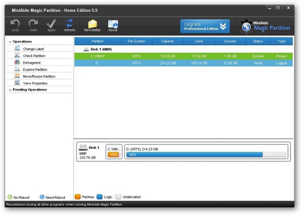 MiniAide Magic Partition Home是一个免费的硬盘分区工具,你可以用它来创建/调整硬盘分区,也可以使用它对分区进行磁盘碎片整理等操作。此硬盘分区工具是完全免费的,你可以用它来替代收费的硬盘分区魔术师,十分适合家庭使用。