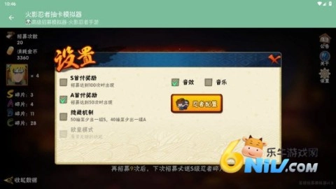7、在设置里,“忍者配置”这一选项能保证你必定招募到所选的忍者碎片。
