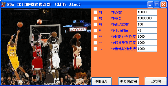 nba2k12 MP模式修改器可修改的有:MP点数,MP训练次数,MP商场时间,mp资金,球队化学反应,联盟受欢迎度,当地球迷支持度。
