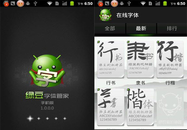 1.绿豆刷机神器首页分为三个区域,最上面部分主要分为:“全部”、“最新”、“排行”,中部为各种下载字体资源的列表,下面部分为“在线”、“本地”、“更多”,三个界面之间进行切换。2.点击“全部”,则显示当前所有字体资源,点击“最新”,则进入到“最新”的字体软件列表显示中,点击“排行”,进入到字体列表,显示在最上面的字体则为下载量和人气最旺的字体软件。