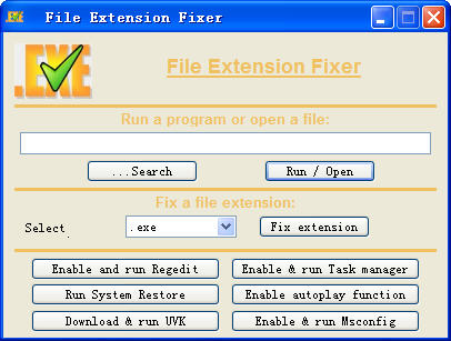 修复文件关联(File Extension Fixer) V1.20 绿色免费版 修复文件关联(File Extension Fixer)是一款修复损坏的可执行文件关联,运行系统还原,并打开任务管理器。文件扩展名定影液是修复损坏的 EXE、 MSI、 REG、 BAT、 CMD 和 COM 文件的方便工具。此外,应用程序为您提供了方便地访问到注册表编辑器,任务管理器和系统配置窗口,很方便,如果恶意软件程序阻止了这些函数。它可以用来运行系统还原和启用自动播放功能