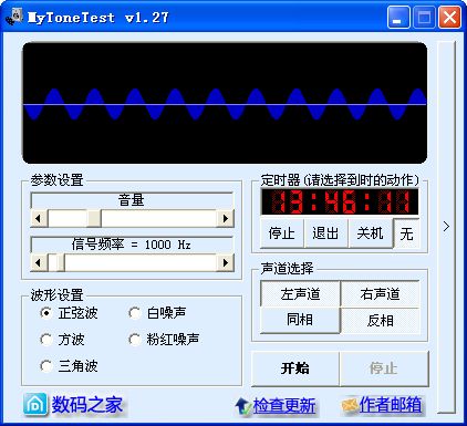 开始使用前,需要适当设置音量(软件默认为最安全的-12dB)并选择测试波形。