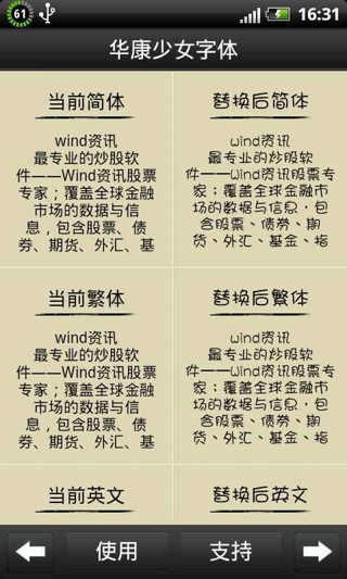 1、 首创“字库补全”技术,针对用户使用频率高的“字体文件”,进行补全,让大家告别“口口口”的无奈!2、 增加已下载字体区分,让你挑选字体时不再迷茫。