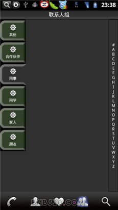 -完美的联络人组管理, 可以建立组,修改组,删除组,设定组铃声,将组放入黑名单对组发送群组讯息等功能,可以使用T9对联络人组名搜寻,可以设定组标签颜色等等,所有组都可以和Google 帐户伺服器直接同步。
