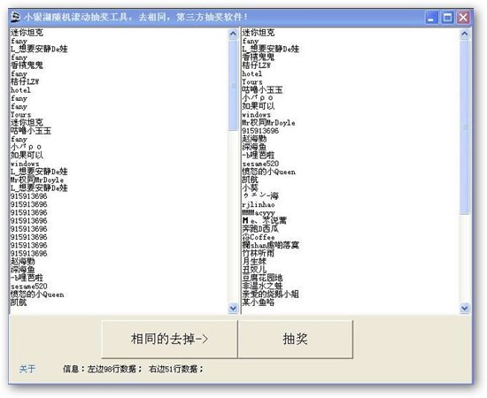小银湖去相同抽奖辅助工具 软件功能: 1.输入很多行数据之后,可以选择去掉相同的数据! 2.对右边的数据进行随机抽取! 3.抽取的结果可以是重复也可以有选项,选择不重复数据!