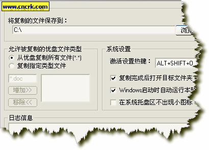 优盘自动拷贝专家 v1.3 绿色版 优盘自动拷贝专家能自动将插到你计算机的任何类型的优盘或者数码照相机的文件复制到指定的文件夹。程序可以隐藏运行,全自动高速复制。优盘一插入计算机USB口就自动复制,让您充分享受零等待的快感!优盘自动拷贝专家可设置只复制指定后缀的文件类型。如果您没有设置优盘自动拷贝专家隐藏图标运行,在正在拷贝优盘的时候,输入法旁边的优盘自动拷贝专家图标会闪烁表示正在复制文件。优盘自动拷贝专家是绿色软件,请放心使用。