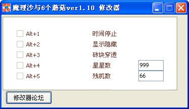 魔理沙与6个蘑菇修改器功能: alt+1 时间停止 alt+2 显示隐藏 alt+3 砖块穿透 alt+4 星星数修改 alt+5 残机数修改为制定的数量 需要进入游戏后才能使用