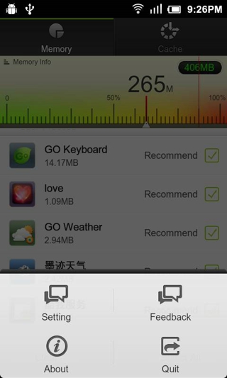 支持系统小部件和GO小部件:直接在桌面上查杀任务,如果您有使用GO桌面,即可使用GO小部件,GO小部件可以支持动态效果和主题替换。