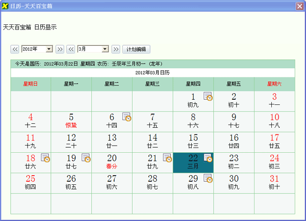 天天百宝箱包括了平时你需要的所有常用功能。如公历农历查询 ,计划提示,计账管理,定时关机,屏幕捕捉,网页截图,系统垃圾清理,图片自动播放等功能。