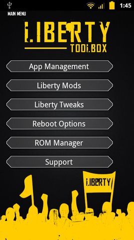 Liberty工具箱为捐赠版本。这个应用程序装入tons专为Liberty工具箱的用户定制。不久,捐赠版本将能够获得姜饼nightlies和Liberty工具箱早期版本的ROM!这个程序也会为您安装Liberty工具箱的ROM。
