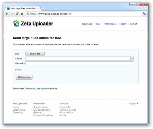泽塔上传Zeta Uploader是一个免费软件 Windows 工具,允许您发送大型文件的邮件以最小的努力。该程序背后的想法是很简单: 用户只需选择要上传,定义接收电子邮件,输入消息的文件,这就是一切。