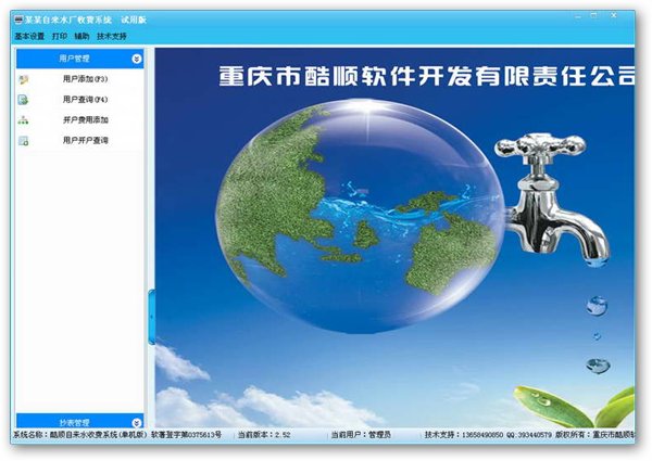 2.收费查询增加按本期结余显示。 《酷顺自来水收费系统(单机版)》是本公司从事基层收费行业十余年,根据水厂的实际情况编写的一套完善的收费系统。本系统包括了八大组成部分:用户管理、开户管理、抄表管理、预存管理、收费管理、减免管理、短信平台、数据报表。经过三年100家收费企业使用,取得了良好的经济效益和社会效益。
