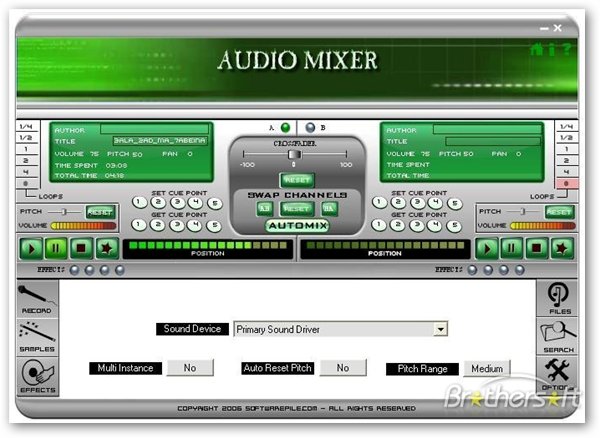 混音软件(Audio Mixer) 1.0 英文版 音频混音器Audio Mixer 能够发挥多个 MP3 文件 simultaneosly 和创建大混合。该应用程序支持拖放,所以使用它不会造成任何问题,即使对于新手。可以将您自己的音乐文件导入到库并将它们放如你所愿在混合窗格。实验与多个音乐文件和记录分层音频输出