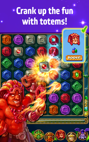蒙特祖玛的宝藏采用了消除类游戏“二个一换,三个一消”的基本规则,通过移动两个相邻的方块,若交换后有3个或更多相同颜色的方块连在一起(斜行无法消除),就可以消除掉方块。游戏目的是想尽一切办法收集足够数量的宝石,玩家需要将混杂在方块中的宝石解除出来。在消除3个或3个以上的方块时,如果这些方块中正好有一个是带宝石的话,那么就赢得了一块宝石。当你收集到任务规定的宝石数量则可以进入下一关卡。完成任务后,可以获得分数和黄金奖励,用来购买各种装备及升级。同时游戏中还有各种道具和魔法可供使用。合理的使用这些道具和魔法,会让玩家更快的收集到足够的宝石。