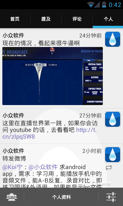 四次元微博客户端是一款个人开发的新浪微博客户端,实质是个测试项目,用来构思我所认为的一个 Android 微博客户端应该有的样子,整体风格是 Android Holo。【新浪微博软件功能】