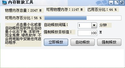 内存释放工具 V1.1 绿色免费版 内存释放工具是电脑内存释放优化大师的升级版,是一款免费绿色的电脑优化的软件。修复了一个自动释放内存时候的BUG