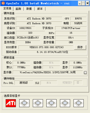 GPUinfo是国内比较牛的显卡识别软件,是gpu-z等多不能比的,可以显示硬件信息、BIOS版本、驱动信息、显存类型、频率信息等,并且还能通过更为底层的信息来识别NVIDIA 的显卡,让那些通过刷BIOS的假N卡无所遁形。