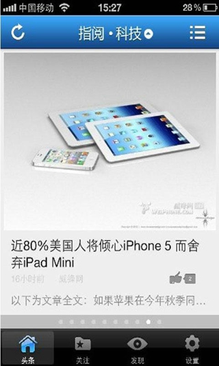 科技无处不在,科技资讯纷繁复杂,关注属于我的科技资讯。指阅科技,你永远不变的选择。指阅 ? 科技是一款整合互联网科技资讯,可个性化订阅的应用软件!是最专业的手机微媒体!指阅?科技将内容划分成移动互联、社交网络、Android、电子商务等十多个分类,有上千个主题,上万个资讯网站来源!用户可以完全根据喜好,按分类、按主题、按网站订阅,浏览自己想看的文章,不想看的通通抛在脑后!顶尖的信息分类技术,庞大的互联网信息源,可自主订阅的操作体验,只需滑动手指,万象资讯,一览无遗!【软件特点】