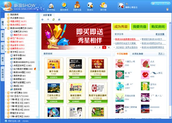 新浪SHOW以房间为单位,有共同兴趣爱好的网友可以欢聚一堂,每个房间最多有3个视频区,以音视频的方式展示个人风采。在这里,您可以引吭高歌,翩翩起舞,畅谈心扉,寻觅同龄知己、同城知音,也可以欣赏精彩的音视频互动节目新浪SHOW视频互动聊天工具,可以让您的网络生活更真实、更酷、更炫!新浪SHOW,百万用户同时在线。新浪SHOW是中国最大的网络视频互动社区,频道汇聚交友、K歌、股票、教学,首页精彩推荐,帮你找到喜欢的房间和朋友,更有视频道具、聊天、录影还有秀星特权,更多互动体验。