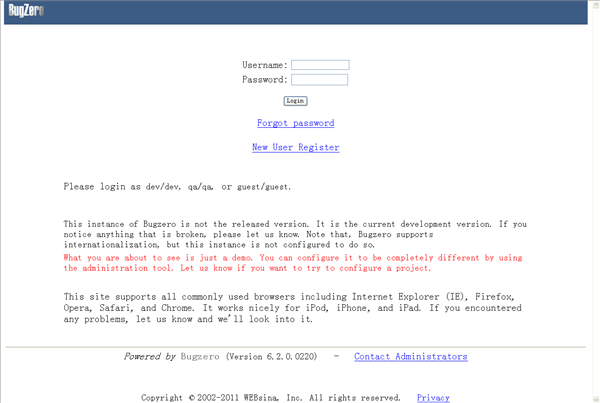 BUGZERO™ 是一个多功能,基于网络 (web-based) 并在浏览器 (browser) 下运行的Bug缺陷管理和跟踪系统 (Bug tracking system),可用来记录,跟踪,并归类处理软件开发过程出现的 Bug 和硬件系统中存在的缺陷(defect)。 BUGZERO 也是一个完整的服务管理软件,包括客户销售管理(Customer and sales tracking),集成服务台热线流程管理(Help Desk), 可用来记录各种日常事务,变更请求,和问题报告,及追踪和处理各种客户讯问,反馈,和意见。
