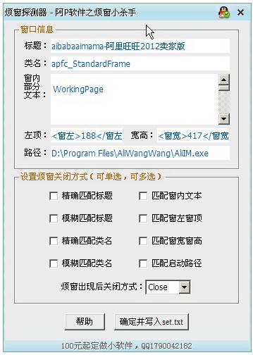 其它:如果通过以上代码仍有“顽固窗口”不能关闭,请将关闭代码置为“其它”,程序将尝试非常规手段关闭烦窗。