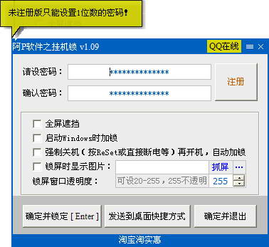 用户可设置锁屏窗口透明度及背景图片。锁屏时屏蔽系统任务管理器、alt+f4及alt+tab组合键以及windows徽标键,确保不被破解,保证挂机安全。用户设置过密码后,再次运行时直接锁屏,省却设置密码的繁琐。