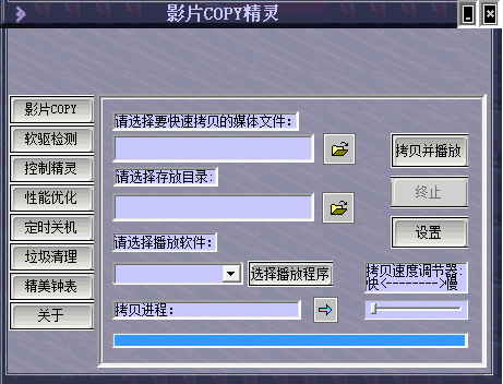 你是否担心经常用CDROM或DVDROM看影片会缩短它们的寿命吗?但又不想等待把文件拷贝到硬盘的时间,那你就可以用软体小精灵一边看影片一边拷贝,而CDROM或DVDROM只要完成把文件拷贝到硬盘的任务就可以休息。这过程只需几分钟的时间这就实现了保护功能。此外影片COPY精灵还提供软驱检测功能,你可以用来校准磁头和清洁磁头,还有定时关机功能、系统优化、清除硬盘垃圾文件功能、杀灭浏览器广告功能、程序管理功能、随意隐藏功能(你可以用它保护你的私隐)。