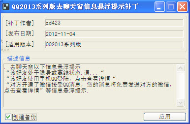 QQ2013去聊天窗信息悬浮提示补丁 1104 绿色免费版 QQ2013去聊天窗信息悬浮提示补丁可以去除聊天窗信息悬浮提示