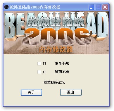 抢滩登陆战2006修改器是针对抢滩登陆战2006中文版开发的一款辅助工具,该辅助提供两项作弊工具,让您游戏更加事半功倍。抢滩登陆战2006修改器 功能: F1 生命不减 F2 弹药不减