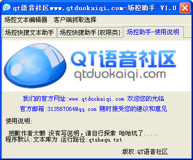 QT语音场控助手 1.2 绿色免费版 QT语音场控助手是一款QT语音辅助工具,集合了各种QT语音便捷功能,轻松当场控,告别复制,粘贴的苦逼时代,该工具是您玩转QT语音的必备工具。